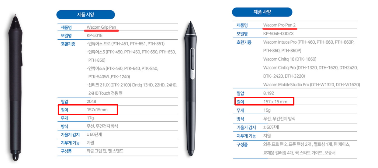 위 사진에 나와있는 펜은 와콤 그립펜입니다. 하지만 쇼핑몰에는 그립펜 전용은 없고 프로펜 2 전용만 있습니다.
